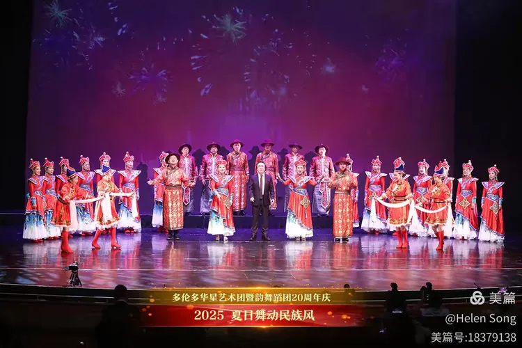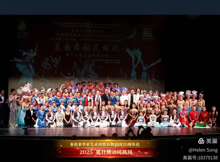 维也纳之声讯:2025年7月26日晚,由多伦多华星艺术团主办、维也纳艺术中心协办的第十七届《夏夜舞动民族风》大型舞蹈专场晚会在列治文山演艺中心盛大上演。作为“文化中国·华星闪耀”系列活动之一,同时也是华星艺术团暨韵舞蹈团20周年庆典的核心品牌项目,本次晚会气势恢宏、精彩纷呈,为多伦多观众呈现了一场民族风情与艺术水准兼具的视听盛宴。